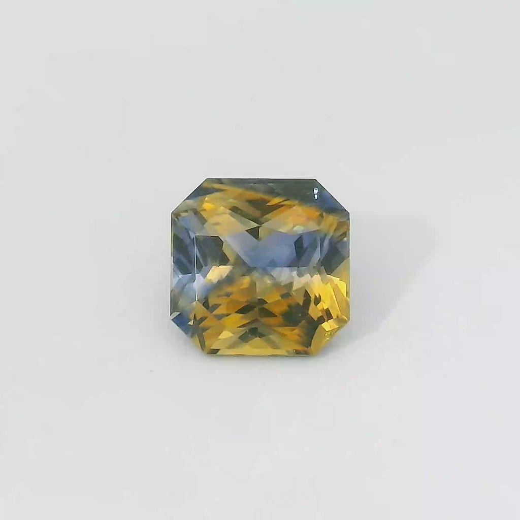 0.72ct Radiant cut Sapphire, featuring striking blue, orange, and parti colouring. This natural gemstone exhibits a unique distribution of hues, making it a compelling choice for bespoke jewellery.