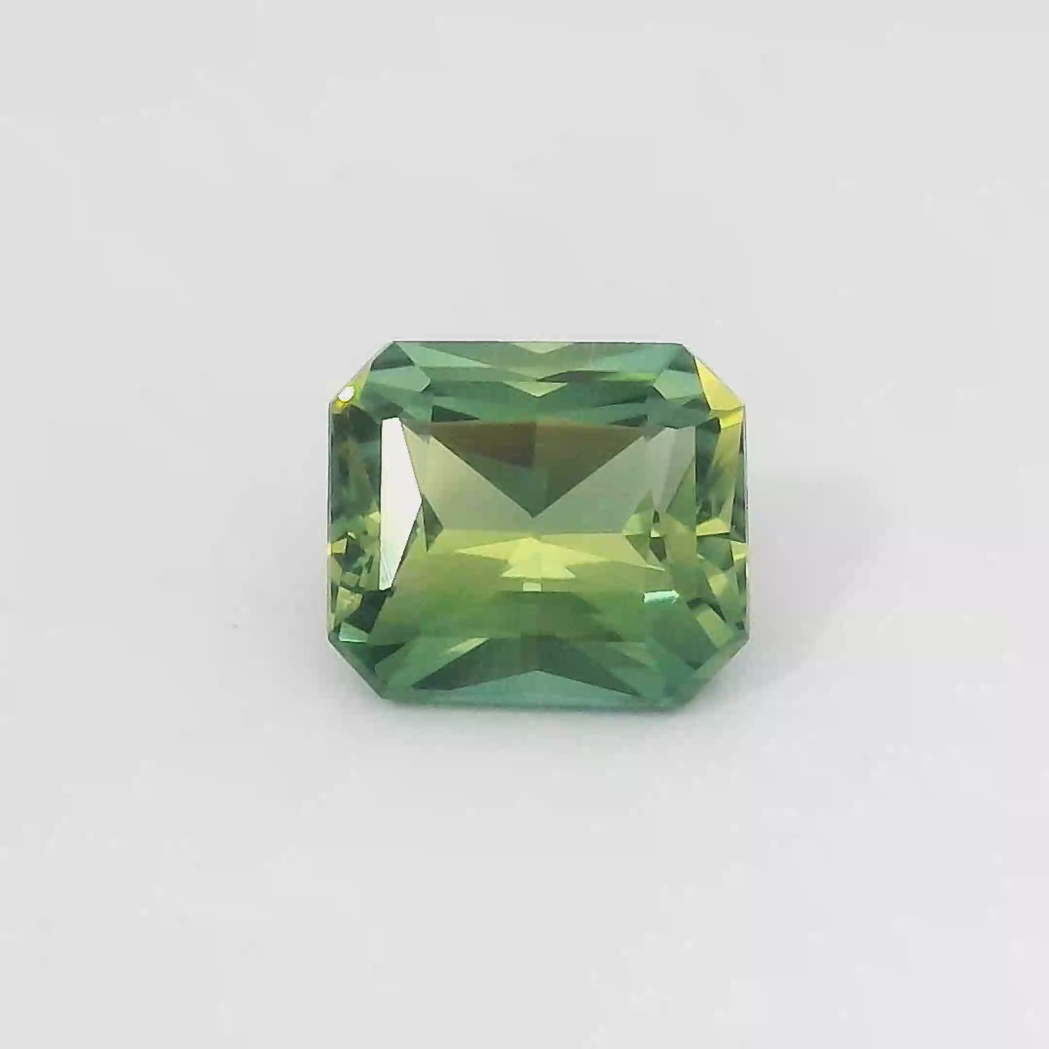 0.78ct Radiant cut Parti Sapphire displays striking natural characteristics. This unique sapphire features a beautiful blend of green and yellow zones, perfect for a bespoke jewellery design.