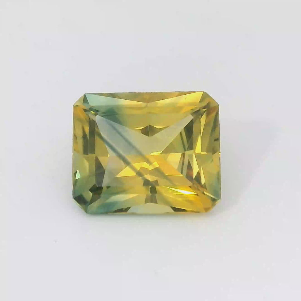 1.05ct Blue, Yellow, Parti Radiant cut Sapphire. This striking natural sapphire displays defined zones of blue and yellow, creating a unique bi-colour appearance. A remarkable investment gemstone.