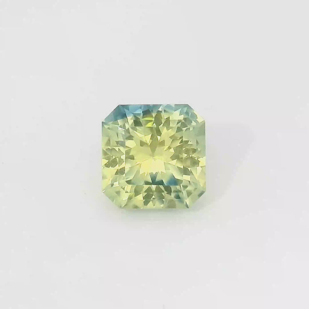 1.17ct bi-colour, blue, yellow, parti radiant cut Tasmanian Sapphire. This natural sapphire displays distinct blue and yellow zones, creating a captivating parti effect. Ideal for custom jewellery designs, showcasing unique natural characteristics.