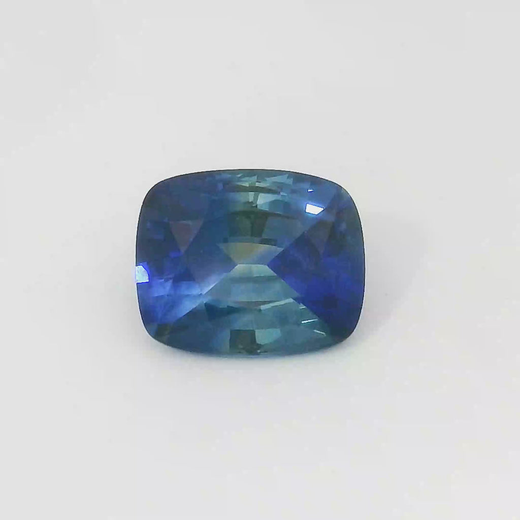 1.20ct Blue, Green, Parti Cushion cut Sapphire. This exquisite natural sapphire showcases vibrant blue and green colour zoning within a beautiful cushion cut. A unique parti gemstone, ideal for custom jewellery designs.