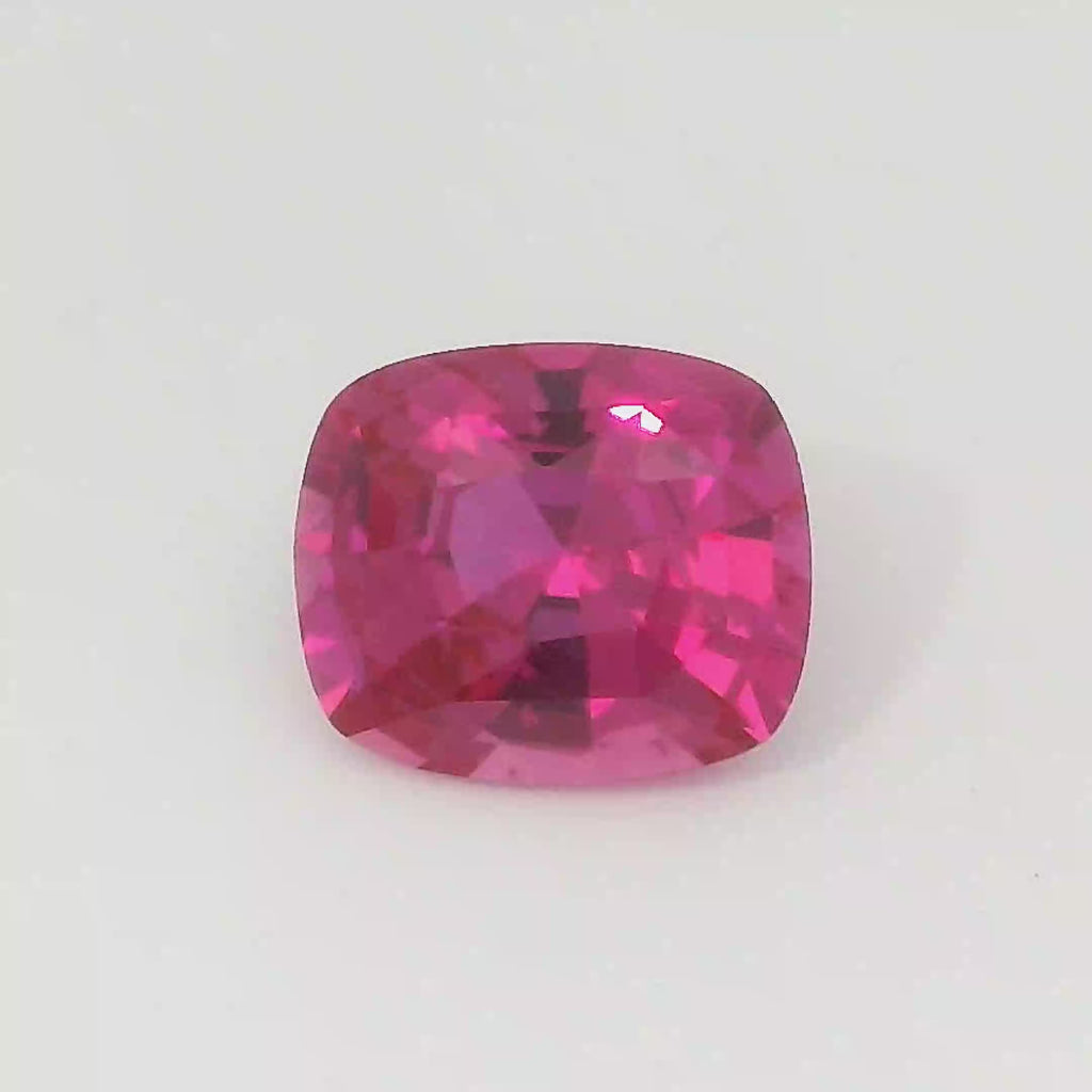 1.24ct pink cushion-cut sapphire. This sapphire displays a captivating pink hue, enhanced by the cushion cut's facets. Its natural beauty is evident in its brilliance and clarity, making it a striking centrepiece for any fine jewellery.