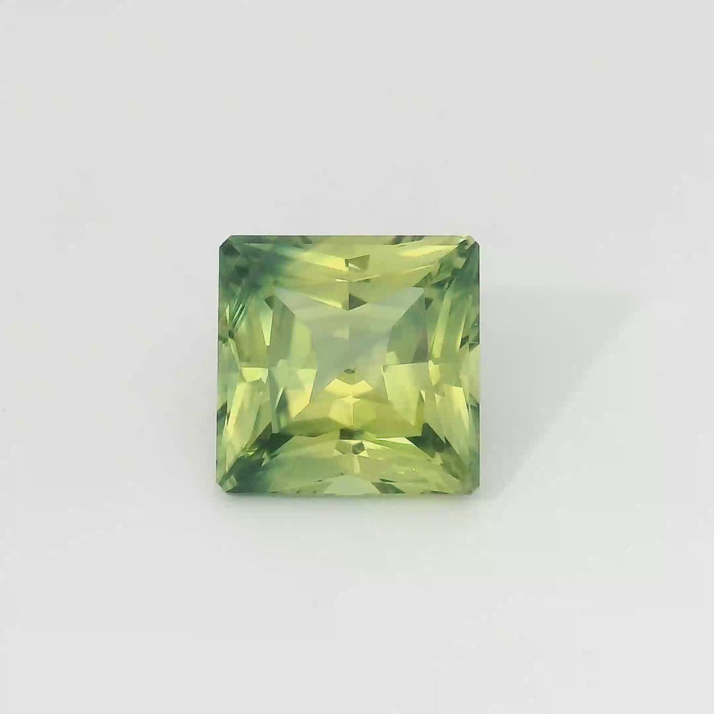 2.22ct Green, Yellow, Parti Radiant cut Sapphire. This striking natural gemstone showcases distinct zones of rich green and vibrant yellow colouration. A unique sapphire ideal for bespoke jewellery.