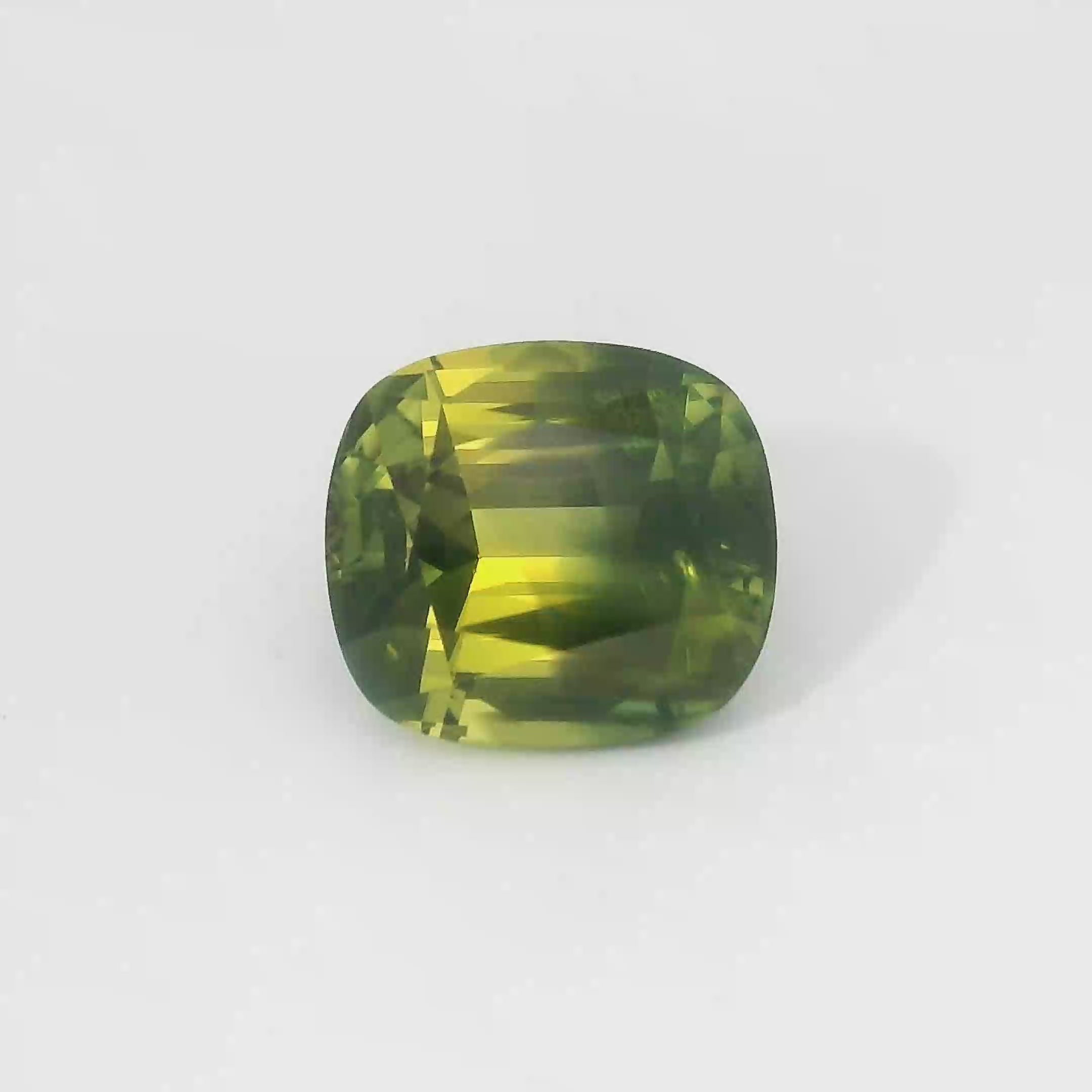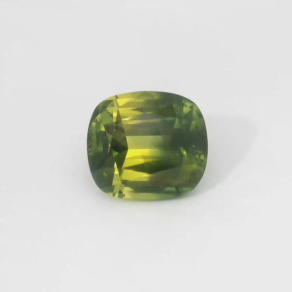 This 2.66ct green, yellow, parti cushion cut sapphire displays distinct colour zoning and exceptional clarity. A naturally occurring gemstone, ideal for bespoke jewellery design. Explore this unique sapphire's captivating hues.