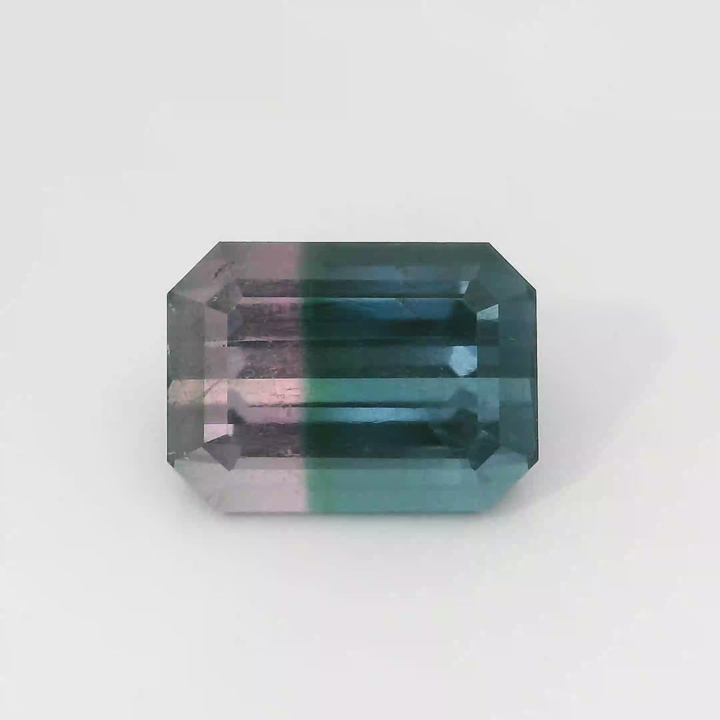 3.84ct Bi-colour Tourmaline, emerald cut. This natural gemstone displays a captivating blend of blue and purple hues. Ideal for bespoke jewellery. Explore our collection of unique, ethically sourced tourmalines.